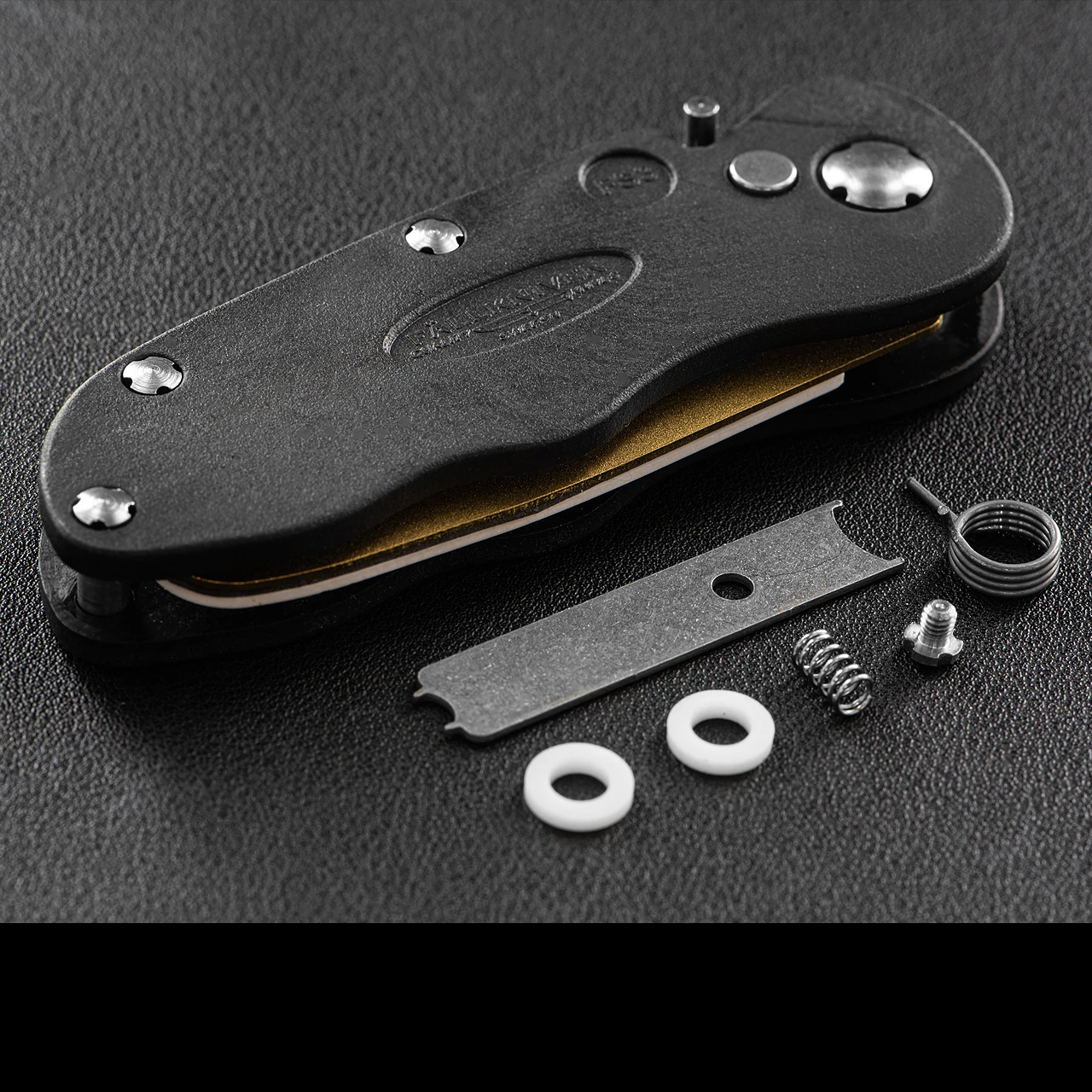 Instructions: Push the catch on the upper section of the handle forward and press the exposed round button. A steel spring will automatically fold out the whetstone and lock it into position. To retract, press the round button and collapse the stone by hand. Fold back the catch to prevent accidental unfolding.