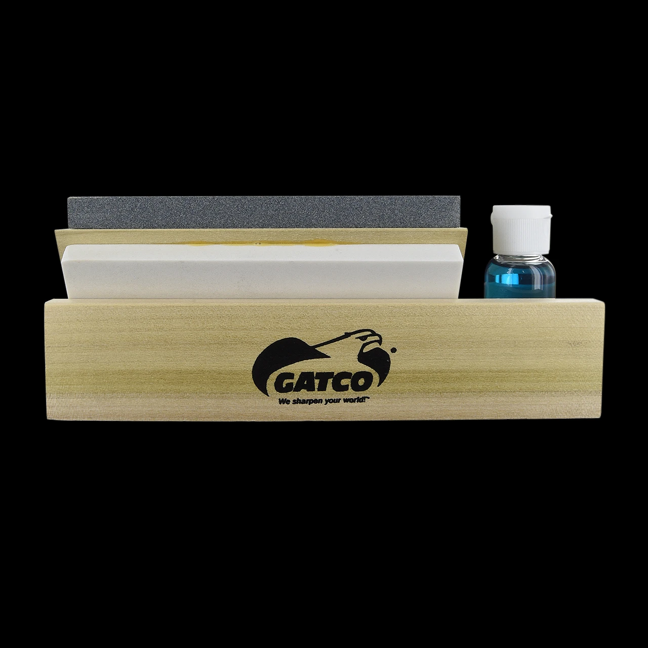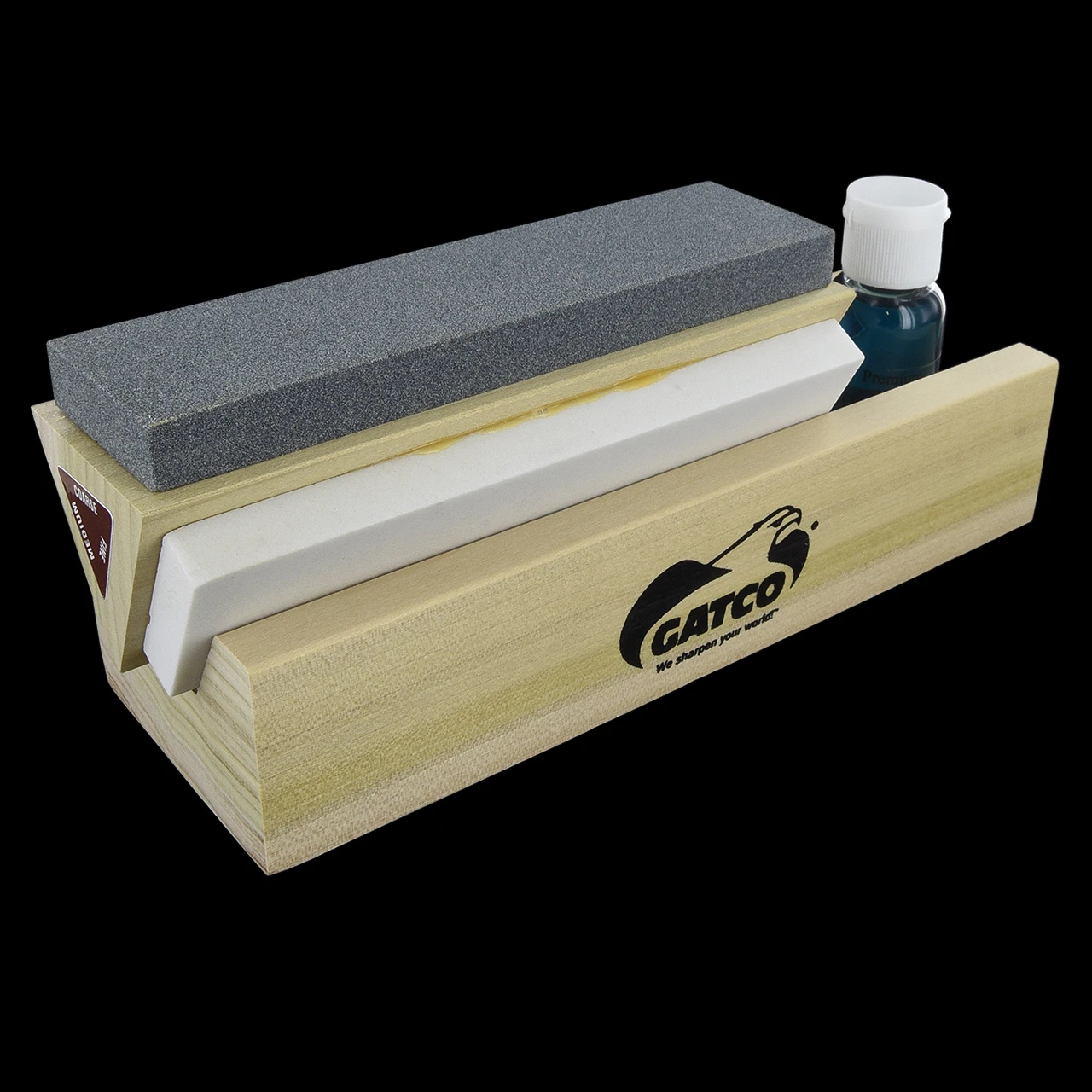 The Gatco Arkansas Tri Hone features three stones; coarse silicon carbide stone; medium natural Arkansas stone; fine natural Arkansas stone.