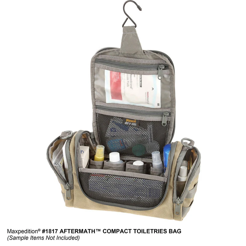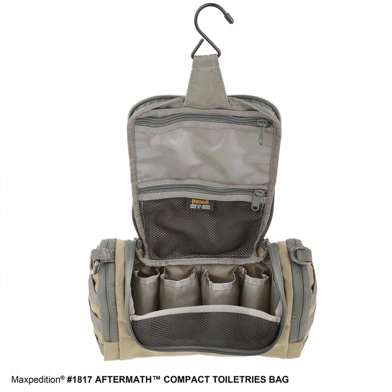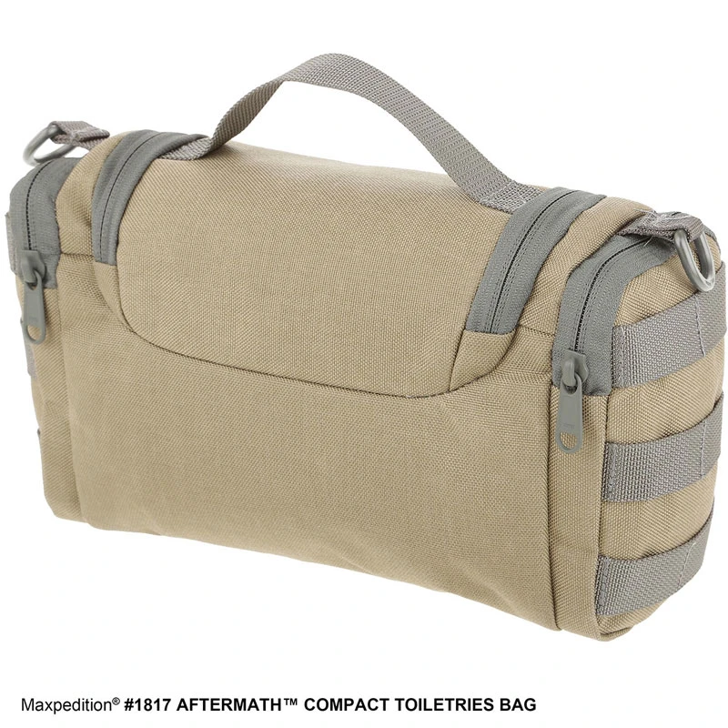 The AFTERMATH toiletry bag is a great new addition to the Maxpedition Travel Range. At 28cm x 17cm x 11cm it makes a great grab bag for your overnight stays or weekends away! Main compartment: 23cm long x 9cm wide x 15cm high with large dual zip opening; fully padded with internal organization. Side pockets: 15cm x 9cm x 2.5cm with internal divider Clear interior window for optional mirror Concealable hang hook Large exterior grab handle Modular webbing for attachment of accessories (3 rows, 2 channels on each side) Exterior 7.5cm x 10cm loop field for patches 1000-Denier water and abrasion resistant light-weight ballistic nylon fabric Teflon fabric protector for grime resistance and easy maintenance YKK high strength zips and zip tracks Triple polyurethane coated for water resistance High tensile strength nylon webbing High tensile strength composite nylon thread (stronger than ordinary industry standard nylon thread) Internal seams taped and finished Paracord zip pulls Stress points double stitched, Bartacked or “Box-and-X” stitched for added strength